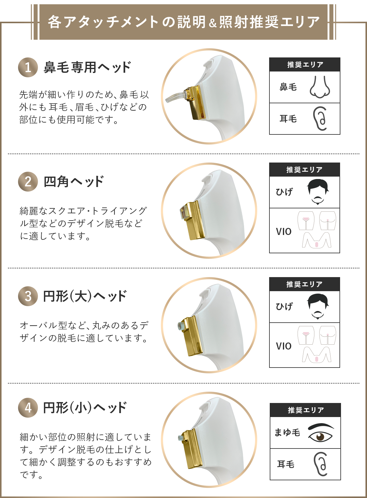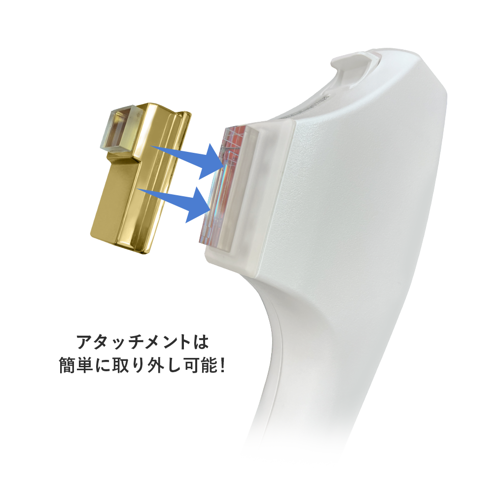 従来では照射できない鼻毛や耳毛などの脱毛が可能になりました。様々な形状のアタッチメントを取り揃えており、ひげ、まゆ毛、VIOなどの細かい箇所にも使用できます。アタッチメントは磁石式になっており、簡単につけ外すことが可能です。