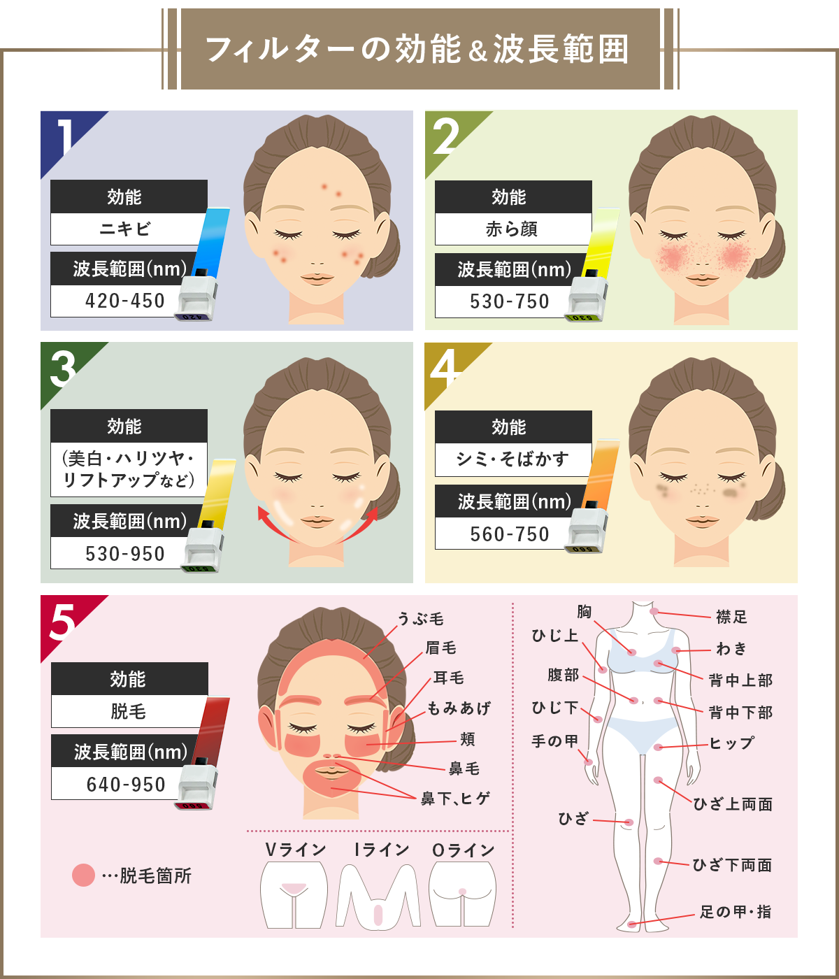 脱毛、ニキビ、赤ら顔、シミになどに作用するフィルターは全部で5種類ございます。それぞれの用途に合わせて簡単に差し替えることができます。