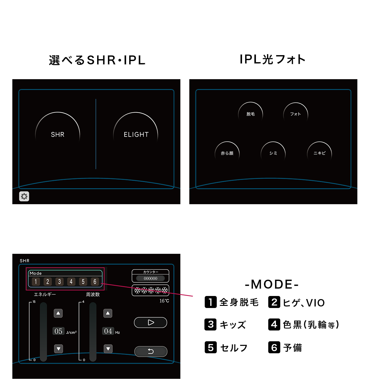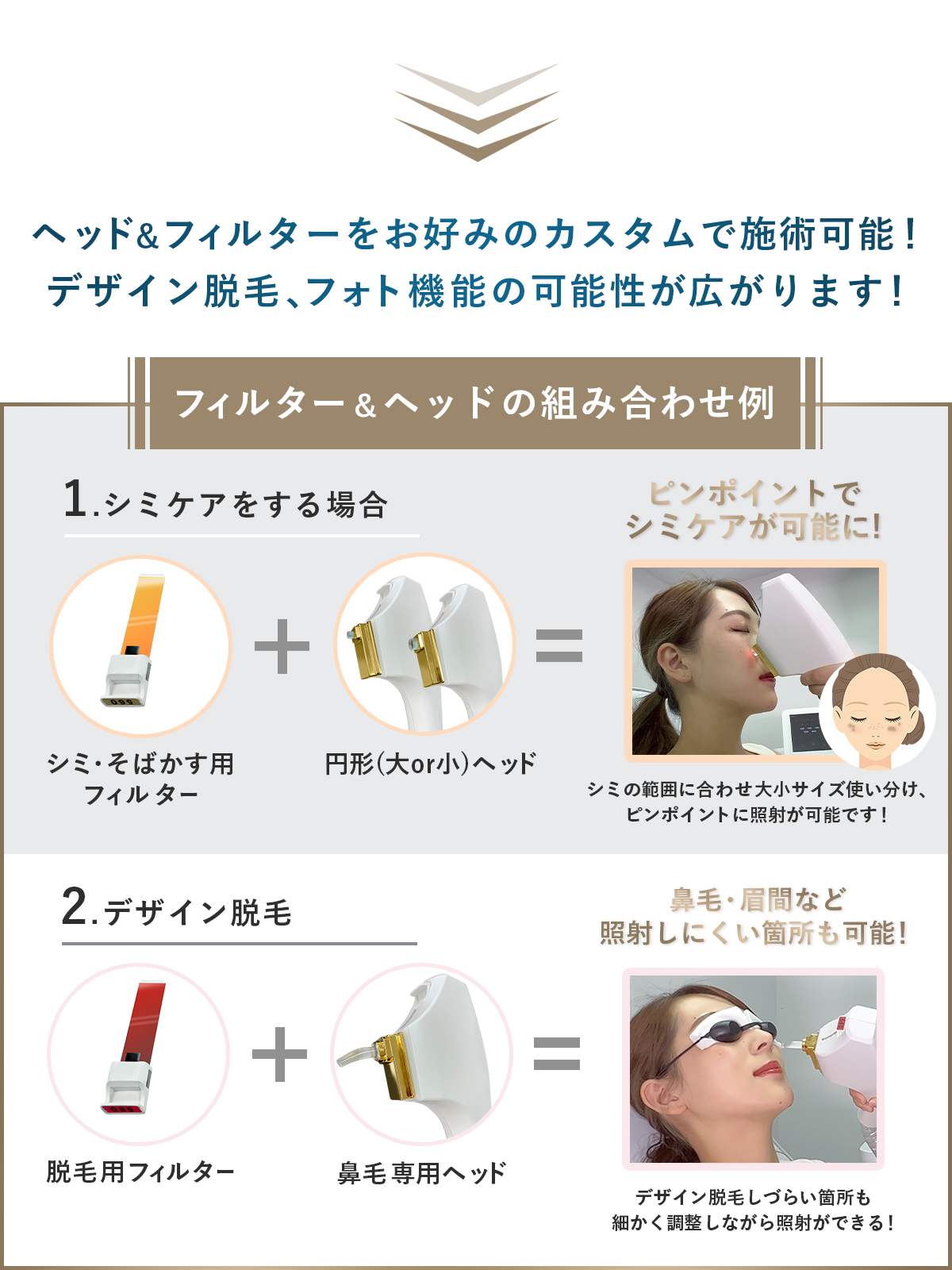 すぐに差し替え可能なフィルター、そしてデザイン脱毛などピンポイントの施術が可能な専用ハンドピース。