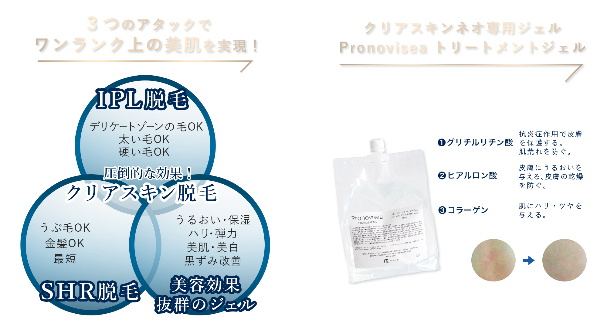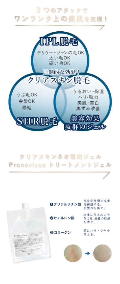 「クリアスキン脱毛」とはIPL・SHR・ジェルの3つの要素を合わせた脱毛方法です。ワンランク上の美肌効果を得ることができます。
